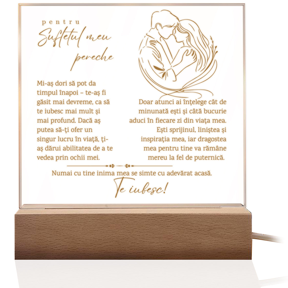 Cadou Pentru Iubit/Iubita, Lampa Decorativa, Placa Acril cu Baza din Lemn si Banda Led Lumina Calda, Cu Mesajul ”Pentru Sufletul Meu Pereche. Te Iubesc”
