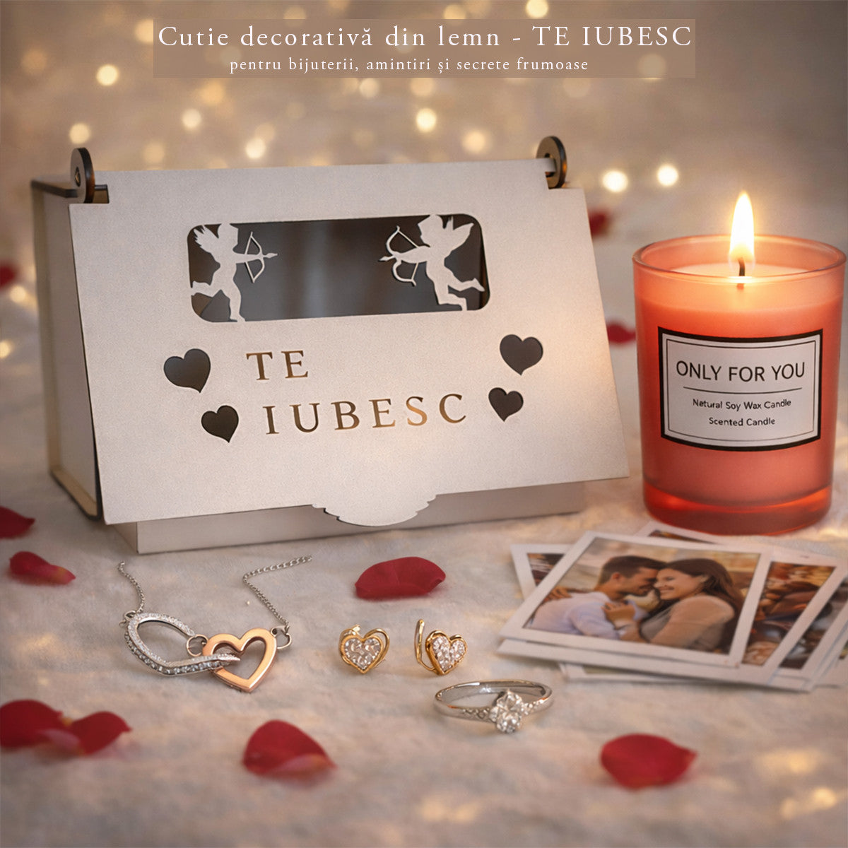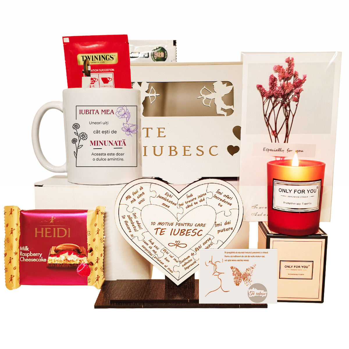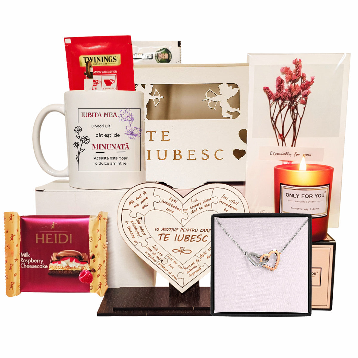 Fiecare element din acest set contribuie la o experienta completa: de la bijuteria eleganta, la obiectele personalizate si delicatesele atent selectate. Este un cadou romantic pentru iubita, care imbina utilul cu emotia si creeaza amintiri de durata.